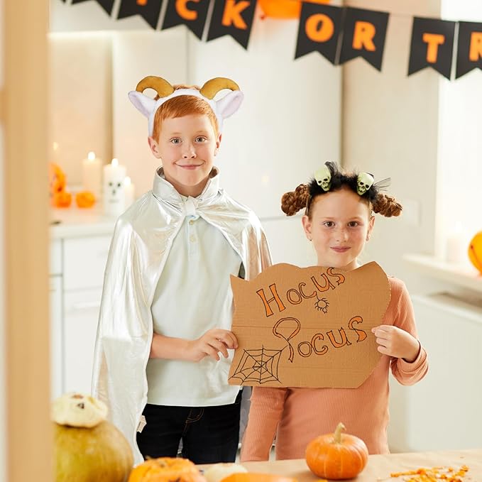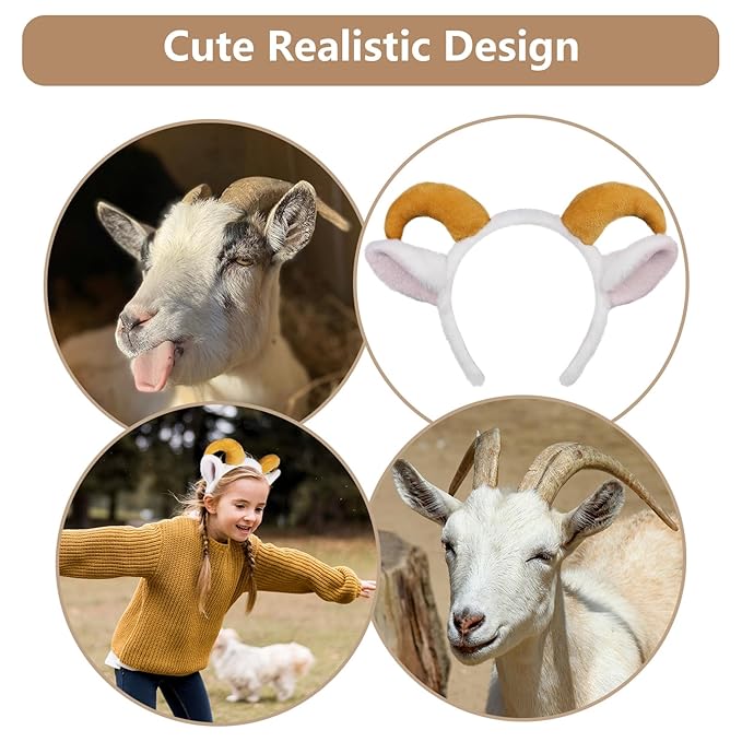 Beviliu Goat Ears Headband with Ram Horns, Animals Ears and Horns Headband, Sheep Ears Custome Lamb Ears Headwear for Halloween Christmas Birthday Party Theme Cosplay, 4Pack