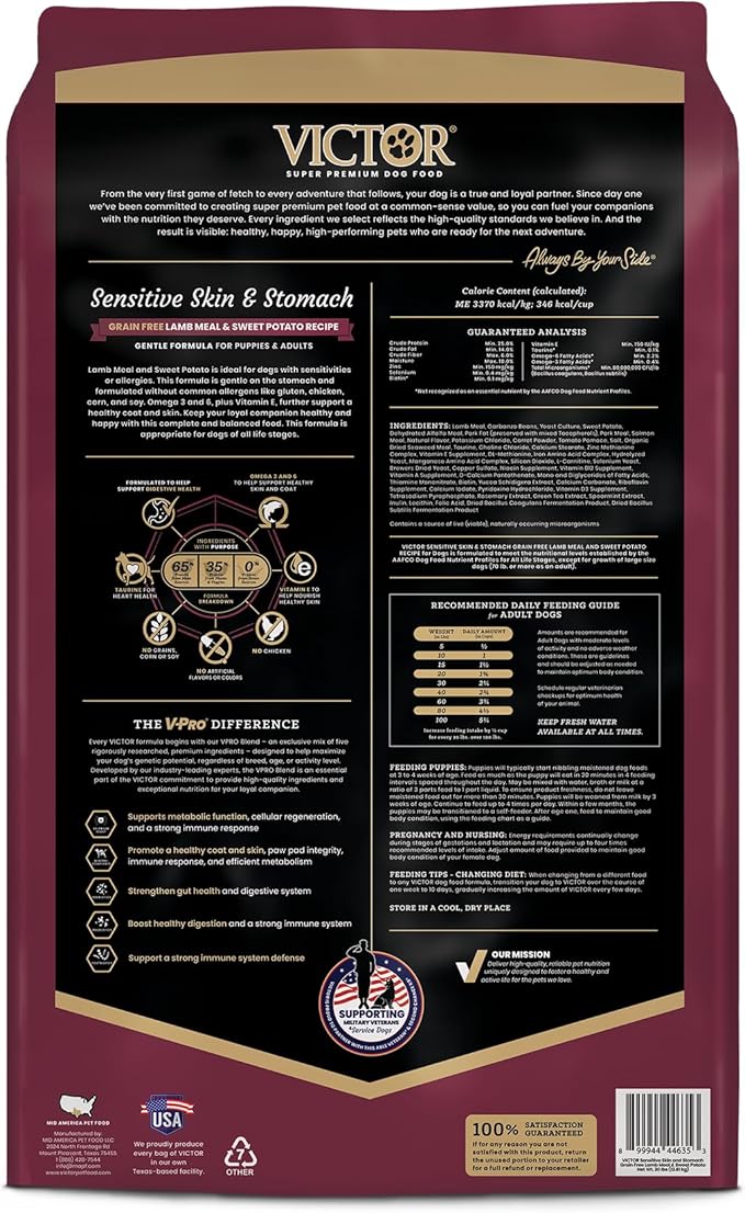 VICTOR Super Premium Dog Food— Sensitive Skin and Stomach— Grain Free Lamb Meal and Sweet Potato Recipe Dry Kibble — Gluten Free, No Chicken, Ideal for Dogs with Allergies — Adult and Puppy Food, 5 lb