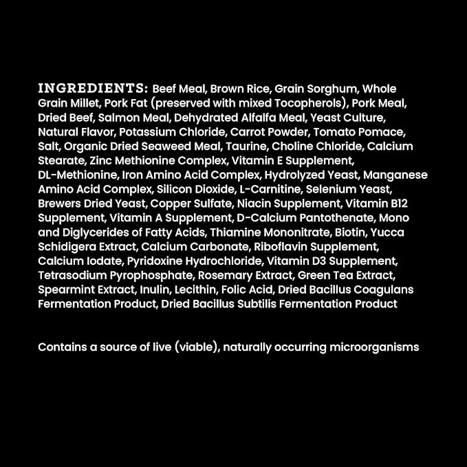 - QUALITY INGREDIENTS: High-quality beef meal is the first ingredient in this nutrient dense recipe. With high amounts of animal protein, we proudly share the percentage of all protein sources on the front of our bag. The high-quality proteins in this recipe help build and maintain lean muscle, sustain energy and promote stamina for a full and healthy life.