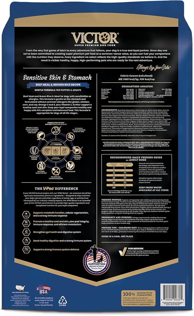VICTOR Super Premium Dog Food — Sensitive Skin and Stomach — Beef Meal & Brown Rice Recipe Dry Kibble — Gluten Free, No Chicken, Ideal for Dogs with Allergies — Adult and Puppy Food, 30 lb