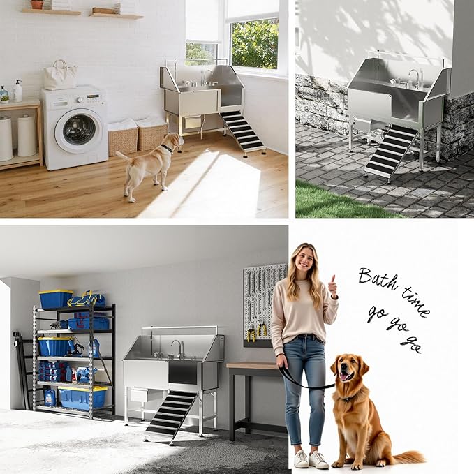 - RUDCXDY dog bathtub features adjustable legs, making it suitable for most owners of various heights and helping to prevent back pain from bending over for long periods. Additionally, the movable, adjustable panel in the dog grooming tub can be positioned to accommodate dogs of different sizes, ensuring a comfortable and efficient bathing experience for both you and your pet
