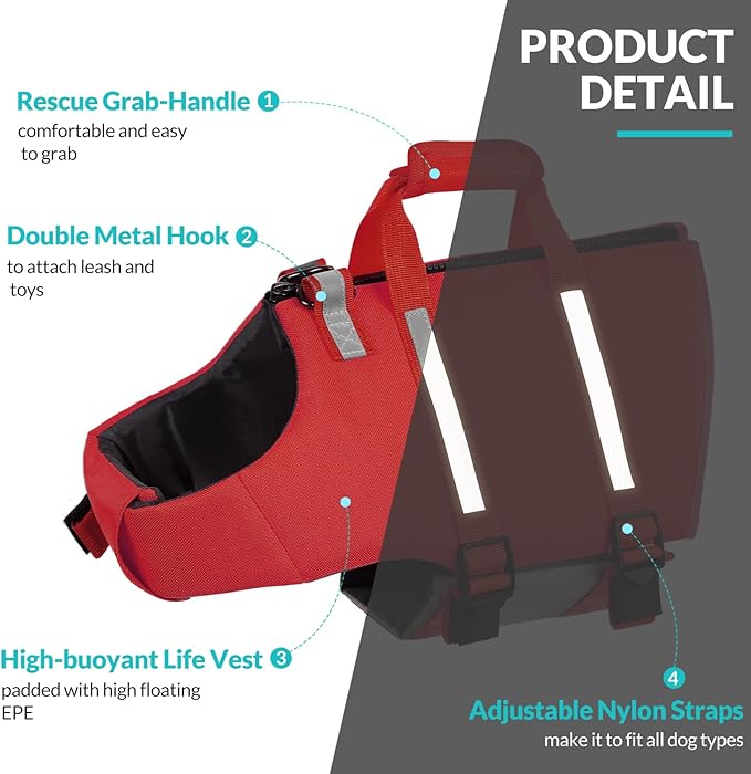 Queenmore Large Dog Life Vest For Swimming, XL Dog Life Jacket, Doggie Life Vest For Swimming Large Breed, Pet Life Jackets For Boating With Rescue Handle, Zipper, Pet Floating Vest For Pool (Red, XL)
