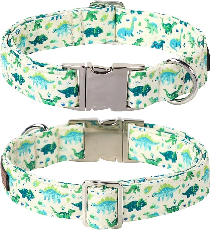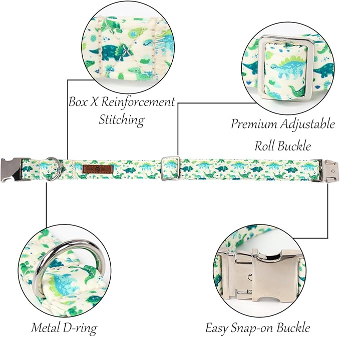 Lionet Paws Dinosaur Dog Collar with Bowtie, Cute Summer Beige Dog Collar for Girl for Small Dogs, Adjustable Cotton Pet Puppy Collars for Small Dogs