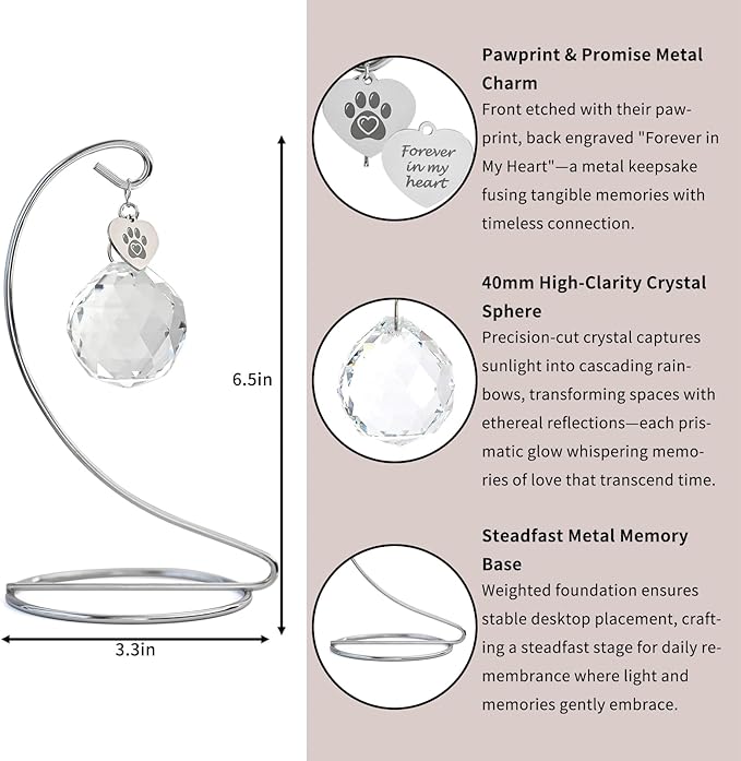 - Heartfelt Gifting: A dog memorial gift that speaks volumes in silence. Each Purastan pet condolence gift includes a thoughtfully curated gift box, a tabletop crystal suncatcher with stand, and a heartfelt sympathy card. Create a touching visual memorial for your cherished dog or cat, designed to harmonize with any home decor while offering solace to grieving hearts.
