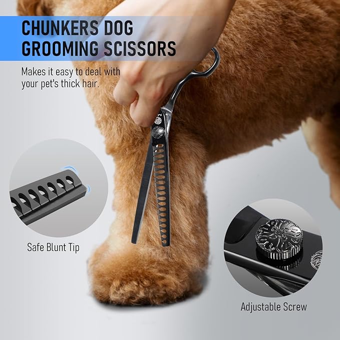 - Adjustable Tension for Customized Cutting Each scissor in the set—straight, curved, and thinning/chunkers shears—comes with a manual tension screw, letting you easily adjust the blade tightness for optimal performance. No more stuck blades or uneven cuts; just seamless grooming tailored to your preference