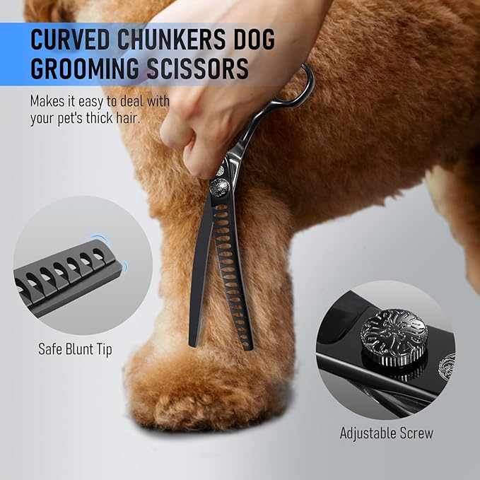 - Adjustable Tension for Customized Cutting Each scissor in the set—straight, curved, and curved chunkers shears—comes with a manual tension screw, letting you easily adjust the blade tightness for optimal performance. No more stuck blades or uneven cuts; just seamless grooming tailored to your preference