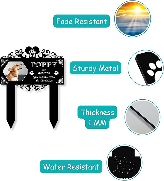 - DURABLE PET MEMORIALS: Crafted from durable metal, these pet grave markers are designed to resist rust, withstand harsh weather, and prevent fading, ensuring a lasting memorial for your cherished pet.
