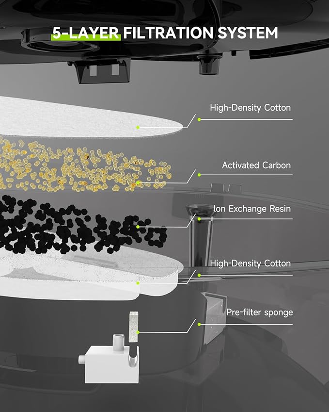 - 【Health-Conscious Design】Made with BPA-free, food-grade materials, FP30 water fountain ensures your pets drink safely. Its generous 7L capacity is perfect for large dogs or multiple pets, while the 6-layer filtration system helps remove impurities, providing fresh, clean water with every sip. 11pcs Replacement Filter can use 2.5 Months