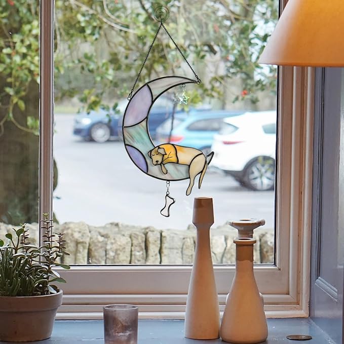 - DOG ON MOON DECORATION: The dog on moon ornament stained glass window hanging include a hook and a chain: easy to use and hangings. Perfect suncatcher for window on a sunny day, you will honor the memory of loved pet when looking at it. The Dog Memorial Sun Catcher transforms your space into a warm and captivating place for dog lovers.It's not just a decoration; it's a symbol of the love and joy your dog brings