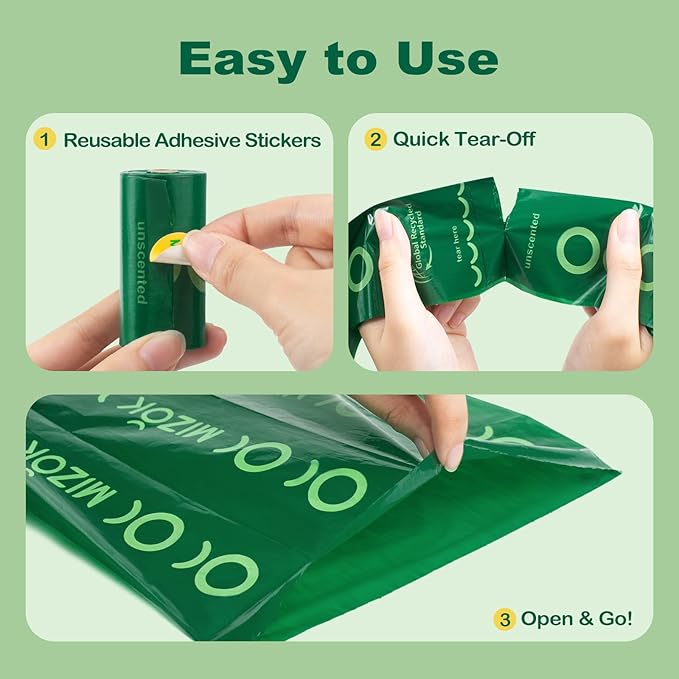 - Sustainable Dog Waste Bags: Made from 65% post-consumer recycled material, these doggie poop bags are strong and durable, helping you reduce environmental impact while caring for your pet