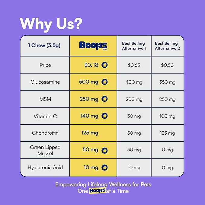 - ๐๐ซ๐๐ฆ๐ข๐ฎ๐ฆ ๐๐จ๐ข๐ง๐ญ ๐๐๐ซ๐, ๐๐ฑ๐๐๐ฉ๐ญ๐ข๐จ๐ง๐๐ฅ ๐๐๐ฅ๐ฎ๐: Boops delivers more active ingredients per chew โ often 50%-100% more than leading brands โ at a better value. You shouldnโt have to overpay for quality. Give your dog the premium joint support they deserve โ without breaking the bank.