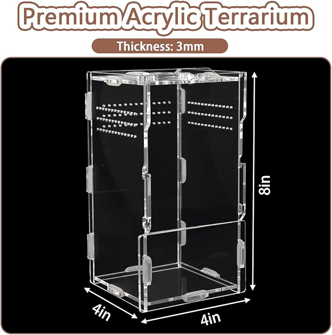 About This 【Complete Enclosure Kit】 Includes: 1x 8"x4"x4" acrylic reptile terrarium + instruction manual Note: Decorations/accessories not included (substrate, plants,... Read more