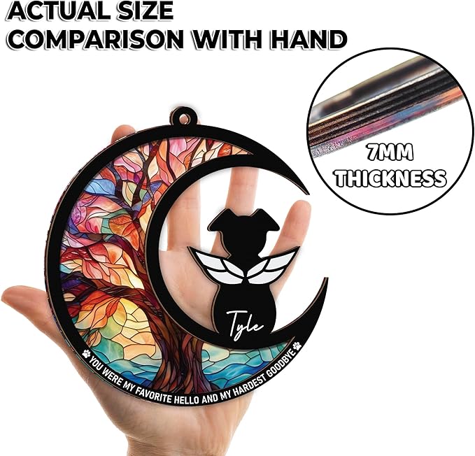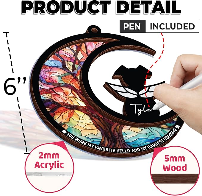 - Rainbow Suncatcher – A Personalized Tribute of Love: This 6" suncatcher features a Tree of Life and angel dog silhouette, crafted from 2mm acrylic and 5mm wood. Includes a special marker pen, allowing you to write your pet’s name or dates directly on the surface, creating a one-of-a-kind tribute that reflects your everlasting bond.