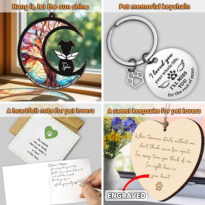 - Complete Sympathy Gift Set for Pet Lovers: This thoughtfully curated 4-in-1 memorial set includes a dog memorial suncatcher with pen, an engraved wooden heart ornament, a stainless steel keychain, and a heartfelt sympathy card. A heartfelt set designed to bring comfort, support, and honor the memory of a beloved furry companion.