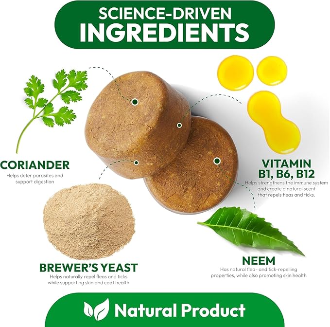 - Natural & Safe Ingredients: Manufactured with carefully selected natural ingredients, our flea and tick prevention for dogs chewable helps protect your dog's health without harsh chemicals.