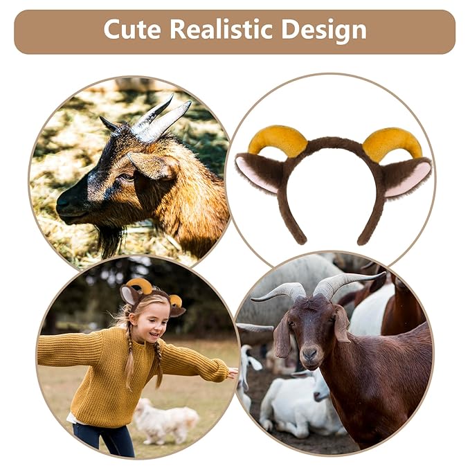 Beviliu Goat Ears Headband with Ram Horns, Animals Ears and Horns Headband, Sheep Ears Custome Lamb Ears Headwear for Halloween Christmas Birthday Party Theme Cosplay, Brown, 1Pack