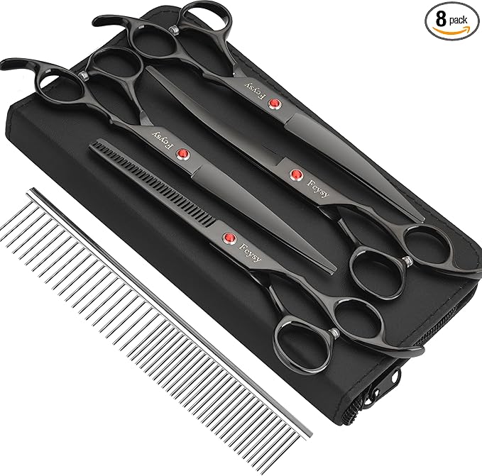 Dog Grooming Scissors Kit, Fcysy Professional Pet Hair Cutting Shears Set with Curved & Straight Blades Scissors Thinning Shears– Stainless Steel Grooming Tools for Dogs & Cats at Home