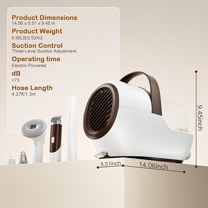 - 🐈Quiet & Stress-Free Grooming: Our pet grooming vacuum for dogs features a low-noise design to keep your pet calm and comfortable during grooming. With 3 adjustable suction levels, your dog will feel relaxed and not scared, even at the highest setting, where noise is below 73dB. This makes it the perfect dog hair trimmer for pets who are sensitive to loud sounds.