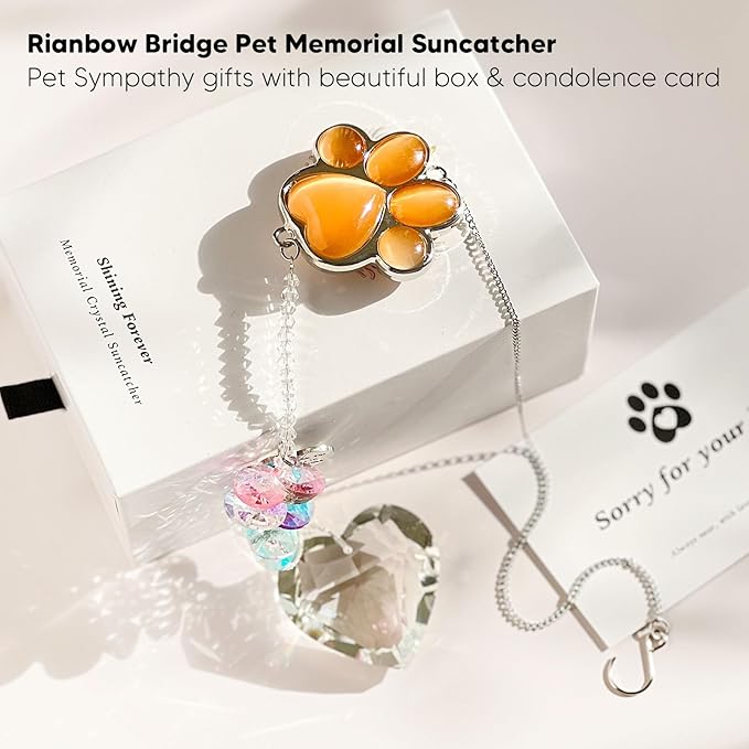 - Crystal Suncather for Pet Mom: A profoundly meaningful gift for yourself, grieving friends, family, or anyone navigating pet loss, this memorial suncatcher becomes a touching tribute to cherished pet companions. Let prismatic light kindle hope, ease grief's weight, and herald healing – transforming sunlight into an eternal promise that love outlives earthly goodbyes.