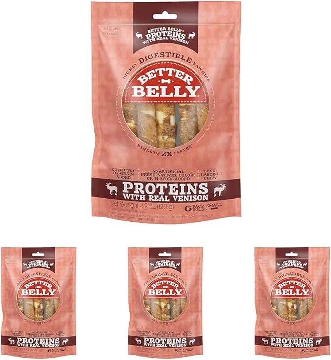 Better Belly Proteins with Real Venison Small Rolls 6 Count, Digestible Rawhide for Dogs, 4.2 OZ (Pack of 4)