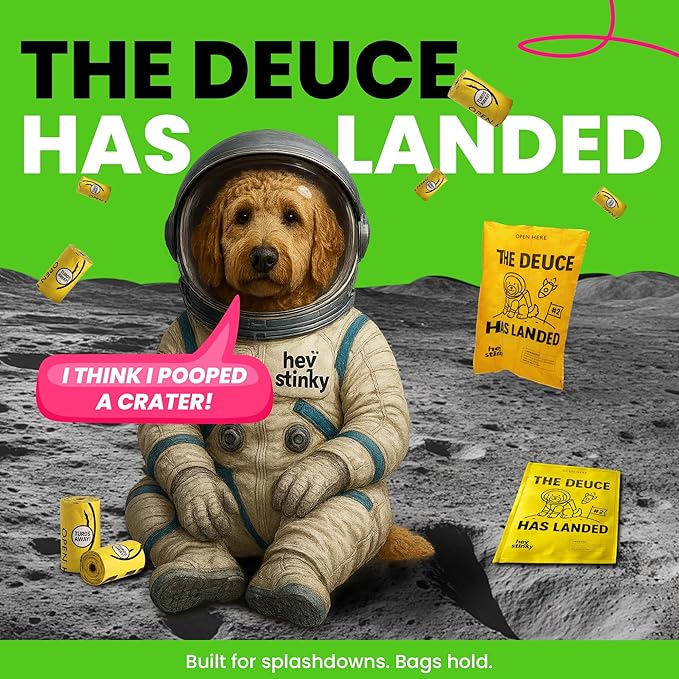 - DOG POOP BAGS WITH A FUN SPACE MISSION DESIGN Featuring our bold “The Deuce Has Landed” print, these extra-strong bags add intergalactic humor to every walk. Perfect for pet owners who want dog gear that’s reliable, leakproof, and a little out of this world.
