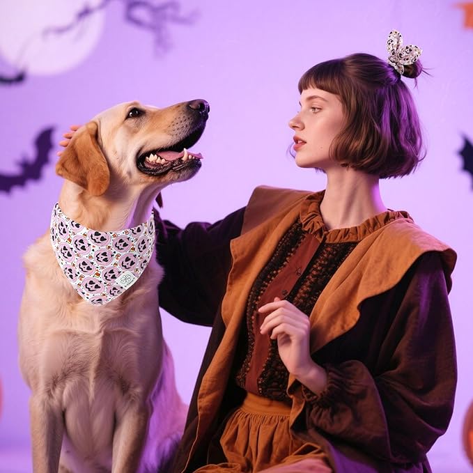 E-Clover Halloween Dog Bandanas & Matching Scrunchie Set Girl Cute Pink Pumpkin Dog Scarf Bibs Pet Bandana with Bow Tie for Small Dogs Puppy Owner Mom