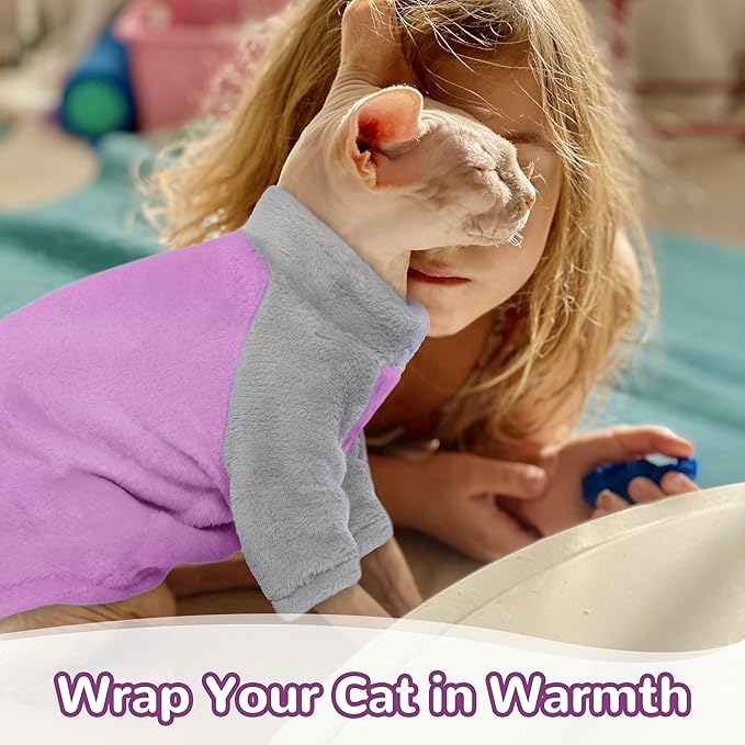 PUMYPOREITY Turtleneck Sweater for Sphynx Cat, Soft Coral Fleece Cat Clothes, Thick Winter Warm Outfit Coat with Sleeves, M, Purple
