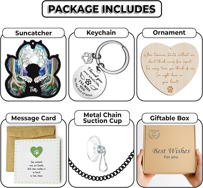 - Thoughtful Sympathy Gift Set for Dog Lovers: Includes a personalized suncatcher, engraved pet memorial keychain, wooden heart ornament, and sympathy card. A complete and meaningful gift set to support anyone grieving the loss of a beloved dog.