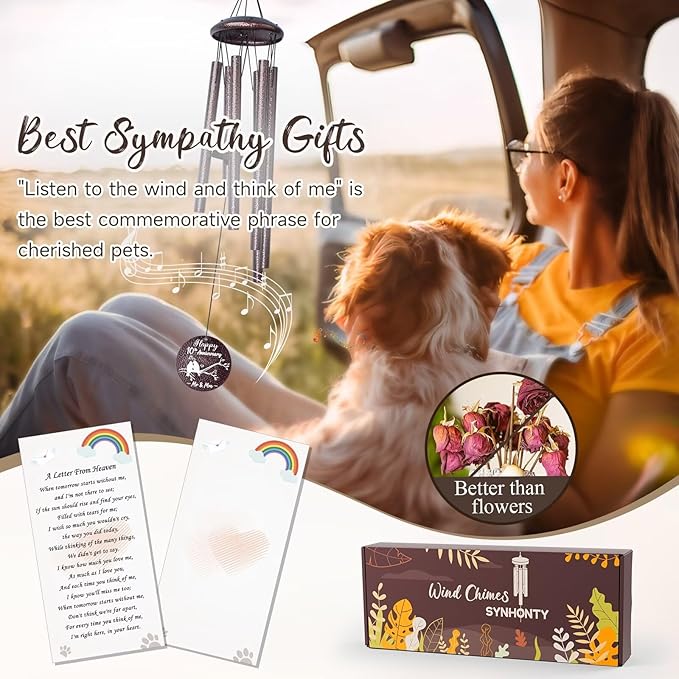 - 【25 Inch Memorial Wind Chimes】Pet Dogs memorial gift comes with sentimental motifs on both sides and is beautifully presented in a box made with natural craftsmanship. Packaged and protected by an elegant gift box, dog memorial gifts hangs wind chimes high as a sign of hope and remembrance.
