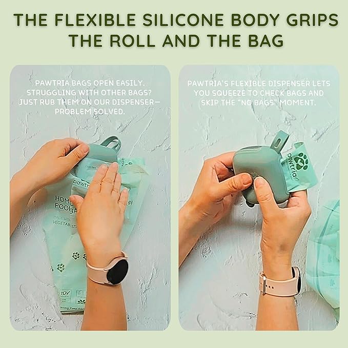 - ✅ Compact, Stylish & Functional: The sleek matte green design (3.25"H X 2.75"L) complements your eco-conscious lifestyle, while heavy-duty silicone straps easily attach to any leash, belt, or bag. Crafted from premium food-grade silicone, Pawtria’s dispenser is non-toxic, dishwasher safe, and emit zero microplastics—helping you protect your pet and the planet.