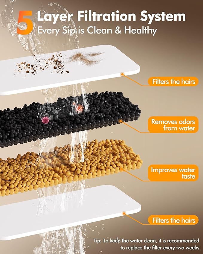 - Ultra Quiet & Multi-Layers Filtration - Dog water fountain with built-in ultra-quiet pump featuring IPX8 protection, don't worry about electric leakage. Noise level is below 25dB, and the low-power design supports 24/7 operation without raising electricity costs. The water pump enhances the multi-layer filtration system, keeping water fresh and flowing. For best pet health, clean the pump and replace filters every 2 weeks