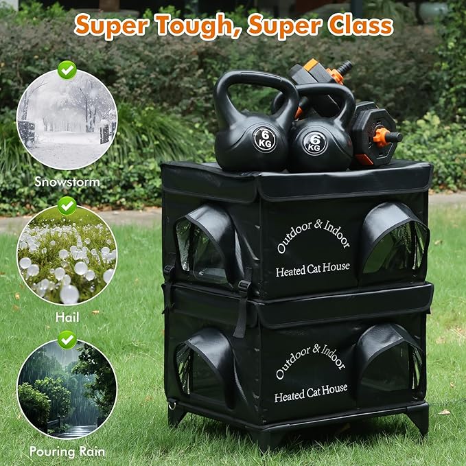 - Two Story Heated Cat House:Two Story Heated Cat House for Outside is a weatherproof and insulated cat shelter designed to provide warmth and protection for multiple cats, Crafted with 5 layers of high-quality insulation,Fully upgraded waterproof awning prevents rain from entering the house, It features Two plush heated cat bed that keeps cats warm even in sub-zero temperatures, and two exits for easy escape from predators,the included outdoor heated cat bed meets high safety standards, providing safe and reliable warmth for outdoor furry friends
