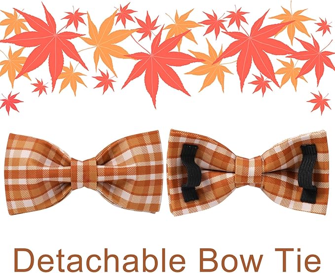 Fall Plaid Dog Collar and Bow Tie Set – Brown Orange Checkered Adjustable Collar with Maple Leaf Charm for Small Medium Large Dogs, Soft Cotton Puppy Collar with Quick Release Buckle