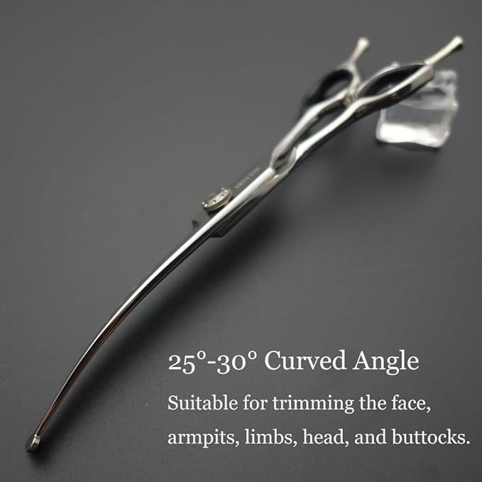 - SHARP EDGE. The edge line of the blade is evenly polished,which make the scissors durably sharp.With meticulously crafted clear tip of tooth ,the thinning scissors are sharp and do not clip the hair.The edge of the curved scissors is 25°-30°,majority standard angle to satisfy most part of groomers.