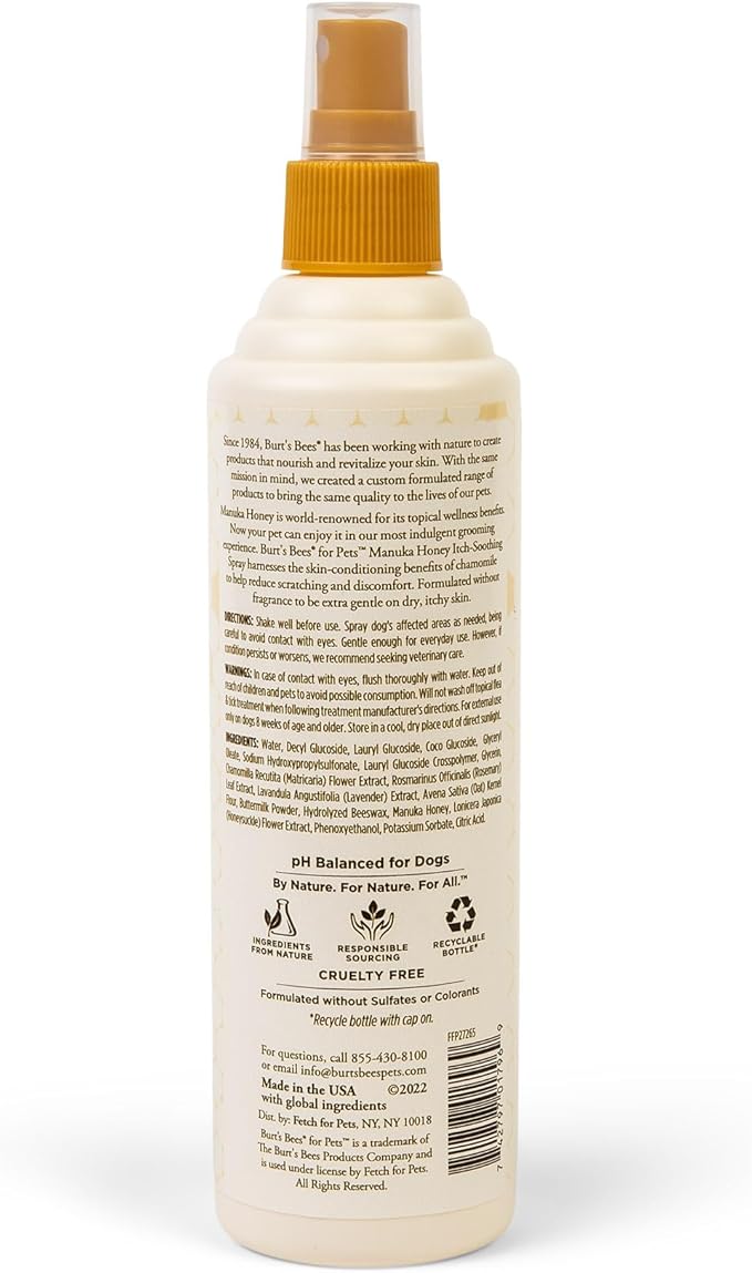 Burt’s Bees for Pets Itch Spray with Manuka Honey and Chamomile for Dogs - Naturally Derived Ingredients, Formulated Without Artificial Fragrances, Sulfates, Colorants, 10 Fl Oz