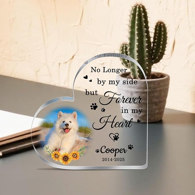 - đŸăPersonalized Dog Memorial Giftsă:Personalized pet memorial plaque with dogs photos name to express sympathy for memorial comfort the grieving for loss of a loved pet. Custom acrylic heart shaped plaque is great pet memorial gifts, dog memorial gifts for loss of dog, pet loss gifts, rainbow bridge dog memorial gifts, loss of dog cat sympathy gift, pet remembrance gift dog, dog bereavement gift, gifts for cat lovers, bereavement gifts dogs, dog memory gifts, in memory of dog gifts, dead dog memorial gifts, custom pet gifts, personalized gift for someone who lost a dog.