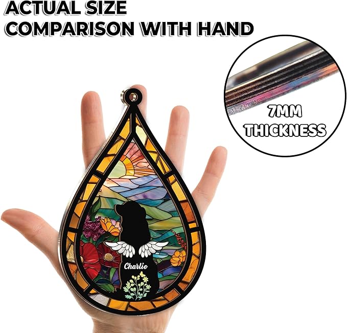- Personalized Pet Loss Keepsake: Crafted from 5mm wood and 2mm acrylic, each custom dog suncatcher includes angel wings and your pet’s name. A touching way to remember your dog with a design that reflects your love and their spirit.