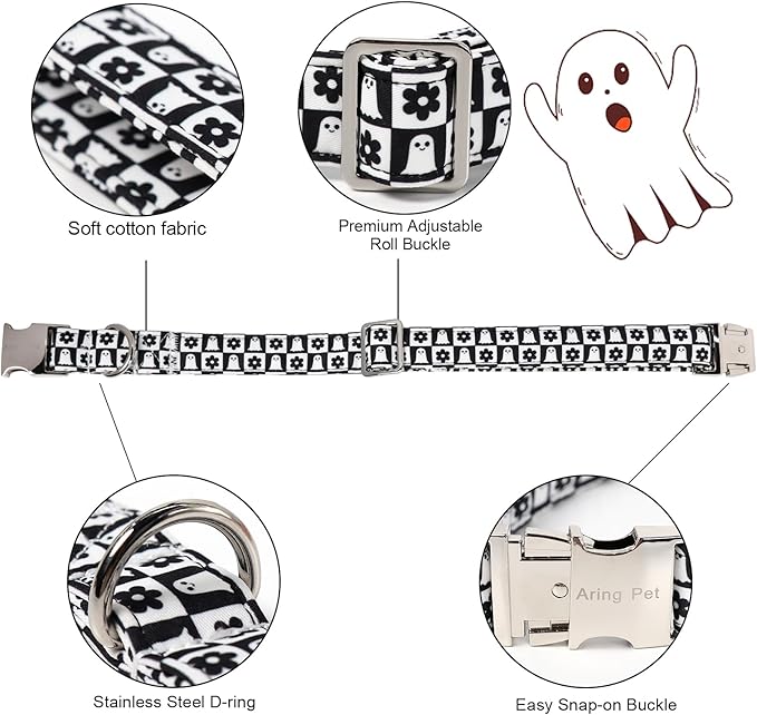 ARING PET Halloween Dog Collar with Bow, Black White Plaid Ghost Floral Cute Pet Collars with Quick Release Buckle for Puppy Small Medium Large Girl Boy Dogs-L