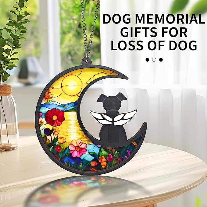 - Beautiful Suncatcher with Symbolic Design: Features an elegant crescent moon, vibrant stained-glass style flowers, and a graceful angel dog silhouette. When sunlight passes through, it creates a stunning display of colors, bringing a sense of peace and warm memory to any room
