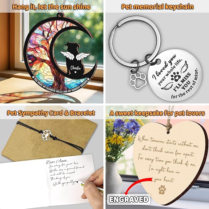 - Thoughtful Sympathy Gift Set for Dog Lovers: Includes a personalized suncatcher, engraved pet memorial keychain, wooden heart ornament, pet remembrance bracelet, and pet sympathy card. A complete and meaningful gift set to support anyone grieving the loss of a beloved dog.