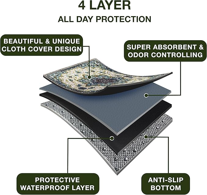 • Maintains Absorption After 500+ Washes - Ultra-absorbent and leak-proof washable dog pee pads. Our multi-layered reusable puppy pads feature a waterproof TPU coating that effectively absorbs and retains liquid, preventing leaks and odors. Designed to withstand repeated washing & urine soaking, these durable whelping pads are perfect for housebreaking, incontinence, or post-surgery care. The non-slip backing keeps the pad securely in place, making it ideal for use on hardwood floors or in crates.