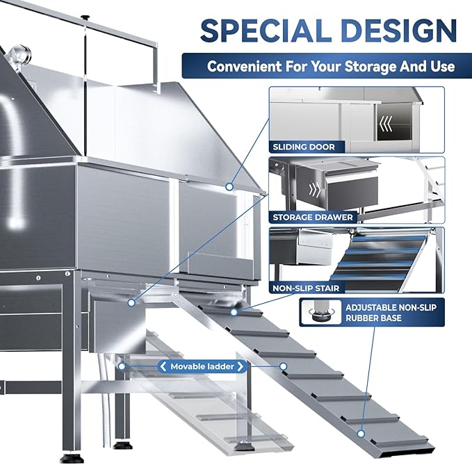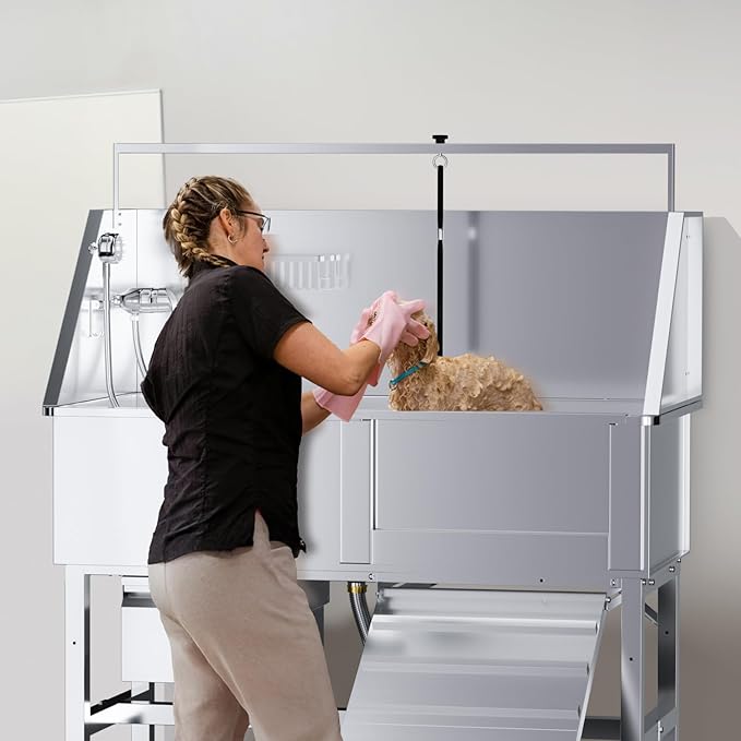 - RUDCXDY dog bathtub features adjustable legs, making it suitable for most owners of various heights and helping to prevent back pain from bending over for long periods. Additionally, the movable, adjustable panel in the dog grooming tub can be positioned to accommodate dogs of different sizes, ensuring a comfortable and efficient bathing experience for both you and your pet