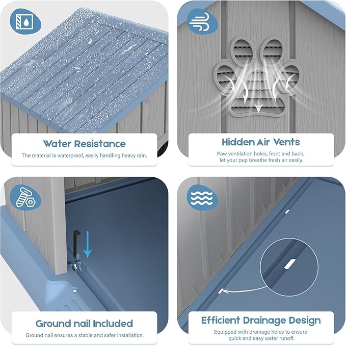 - đžăDurable & Weatherproofă: Crafted from high-quality PP (polypropylene) material, this dog house is waterproof, Whether itâs rain, sun, or snow, your dog will stay dry and comfortable year-round. This doghouse is equipped with ground nail that ensures it stands up to strong wind conditions.
