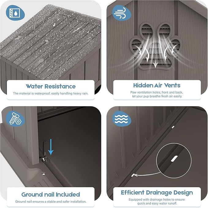 - đžăDurable & Weatherproofă: Crafted from high-quality PP (polypropylene) material, this dog house is waterproof, Whether itâs rain, sun, or snow, your dog will stay dry and comfortable year-round. This doghouse is equipped with ground nail that ensures it stands up to strong wind conditions.