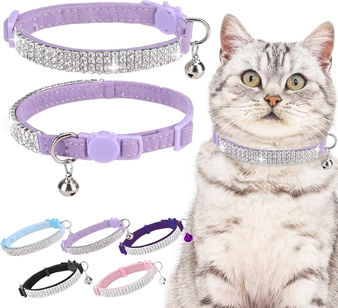 EXPAWLORER Soft Velvet Safe Cat Collars for Girl Cats - Rhinestones Adjustable Collars Breakaway- Chirstmas Cat Clollar Gifts with Bells for Boy Cats Kitty and Small Dogs(XS,Purple)