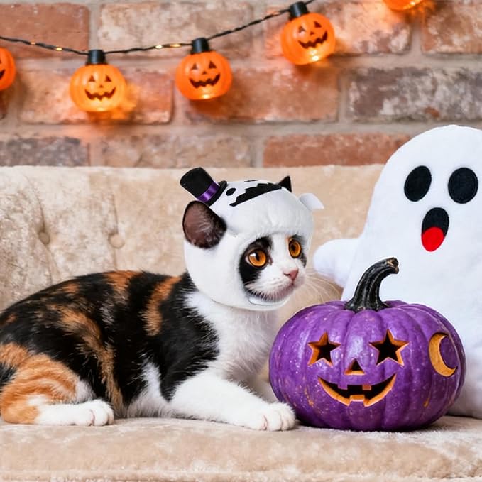About This Charming Ghost Style: This cute white ghost hat with a tiny top hat is an eye-catching cat halloween... Read more