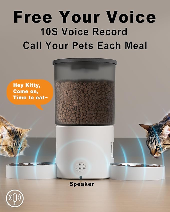 Automatic Cat Feeder for 2 Cats, 4.2L Dual Food Dispenser, Up to 6 Meals/Day, Portion Control, Voice Message, Dual Power Options (Transparent+White, Dual Stainless Steel Bowls)