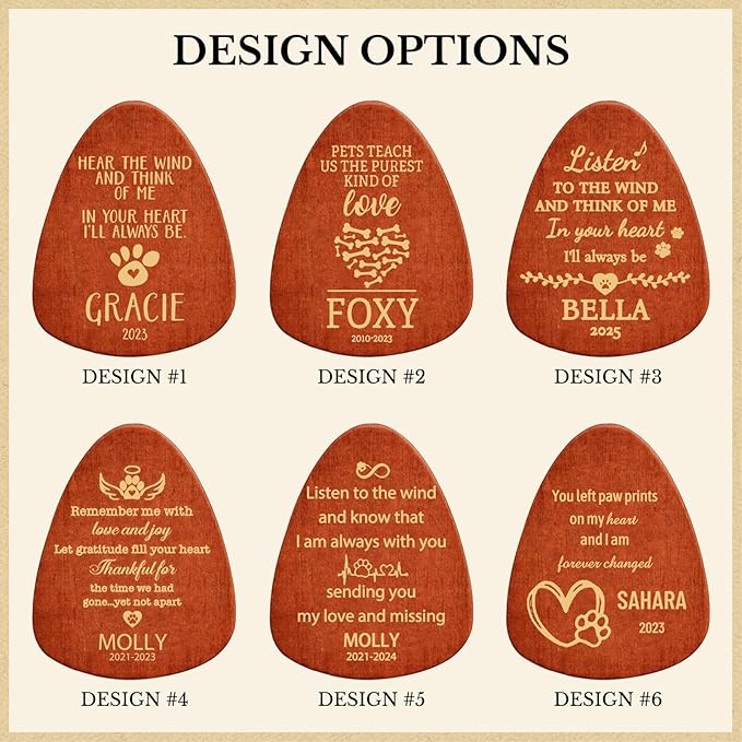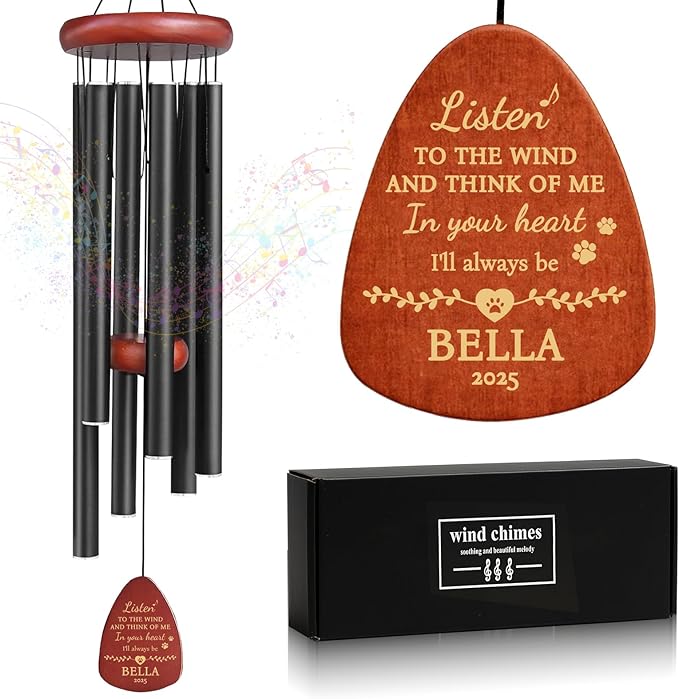 - Personalized Pet Memorial Wind Chimes:Customizing your pet wind chime is quick and easy. Simply click the âCustomize Nowâ button and enter the name and year you wish to engrave. We'll use the design and font shown in the image to ensure perfect layout on your finished product. If you have any questions, feel free to contact us anytime through Amazon to create a beautiful, personalized pet memorial