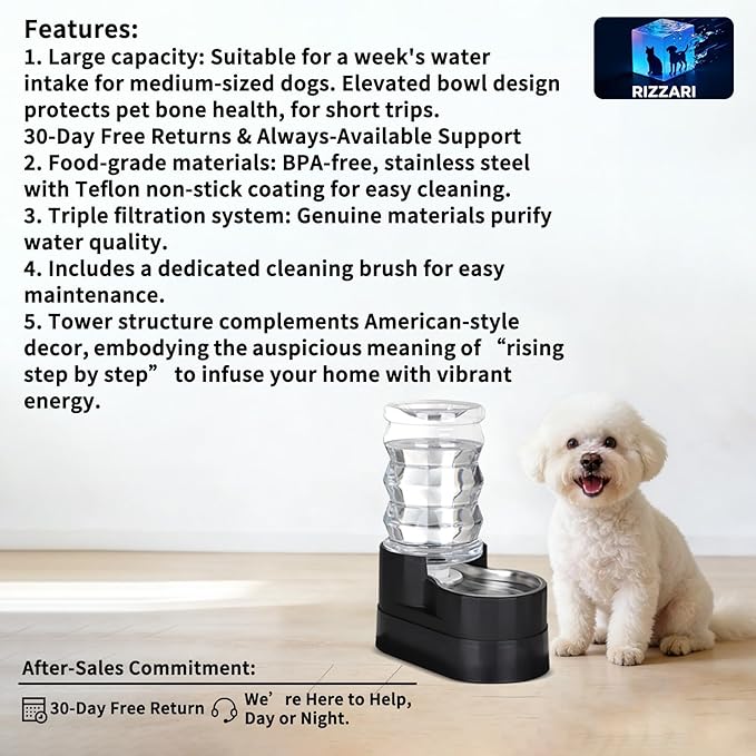 RIZZARI Automatic Cat Water Dispenser: Black 7L Elevated - Stainless Steel Gravity Feeder with Specialized Brush and Triple Filtration - Splash Guard Mat - Use in Bedroom and Livingroom