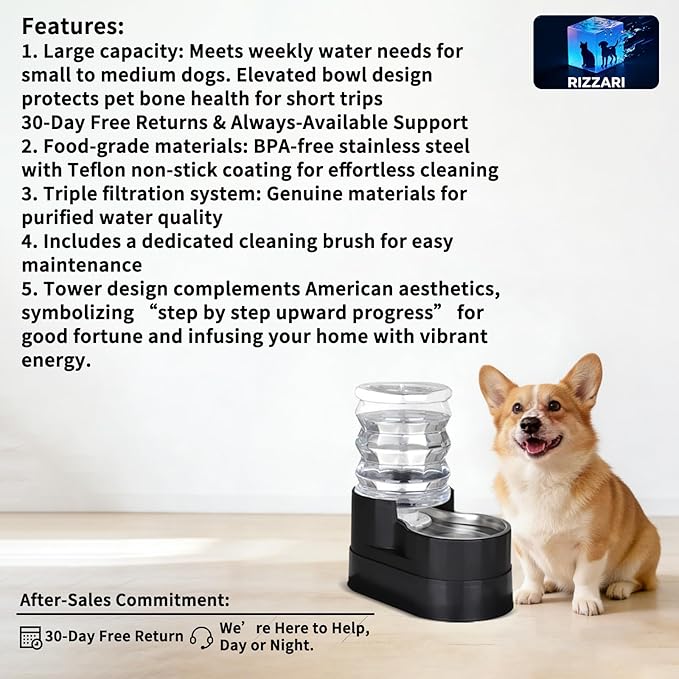 RIZZARI Automatic Cat Water Dispenser: Black 5L Elevated Feeder with Specialized Brush and Triple Filtration - Stainless Steel Gravity Bowl - Leakproof Base for Indoor Pets